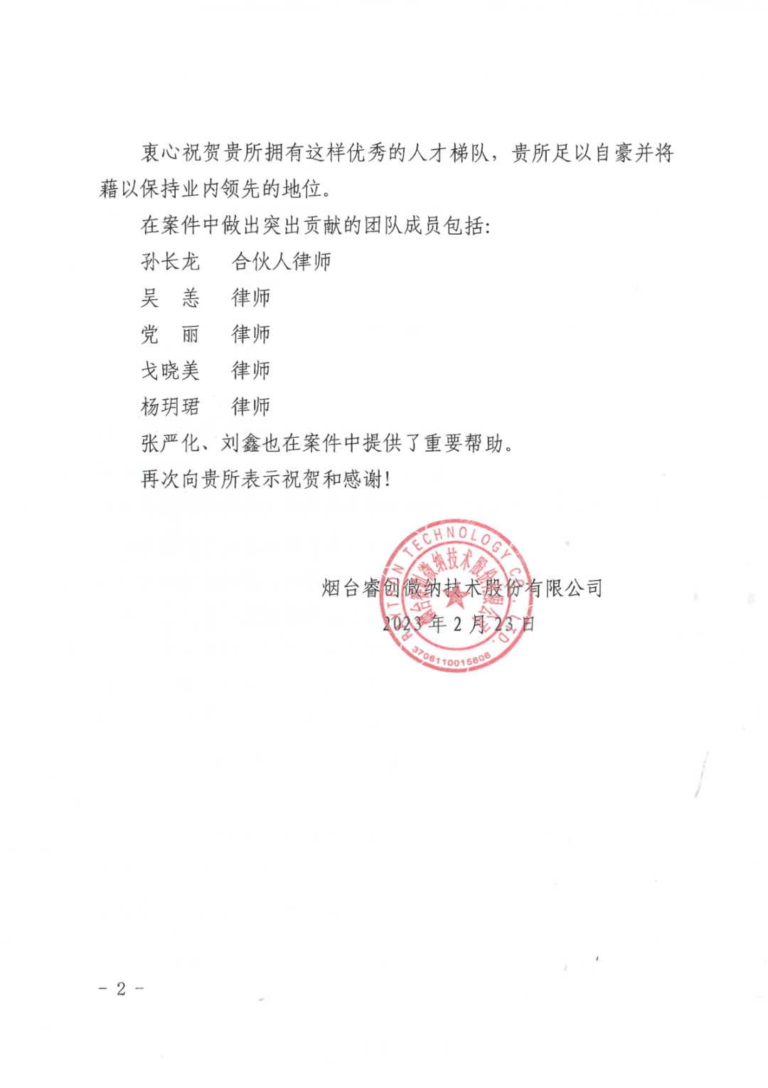 图1 睿创集团向懂球帝寄送的表扬信