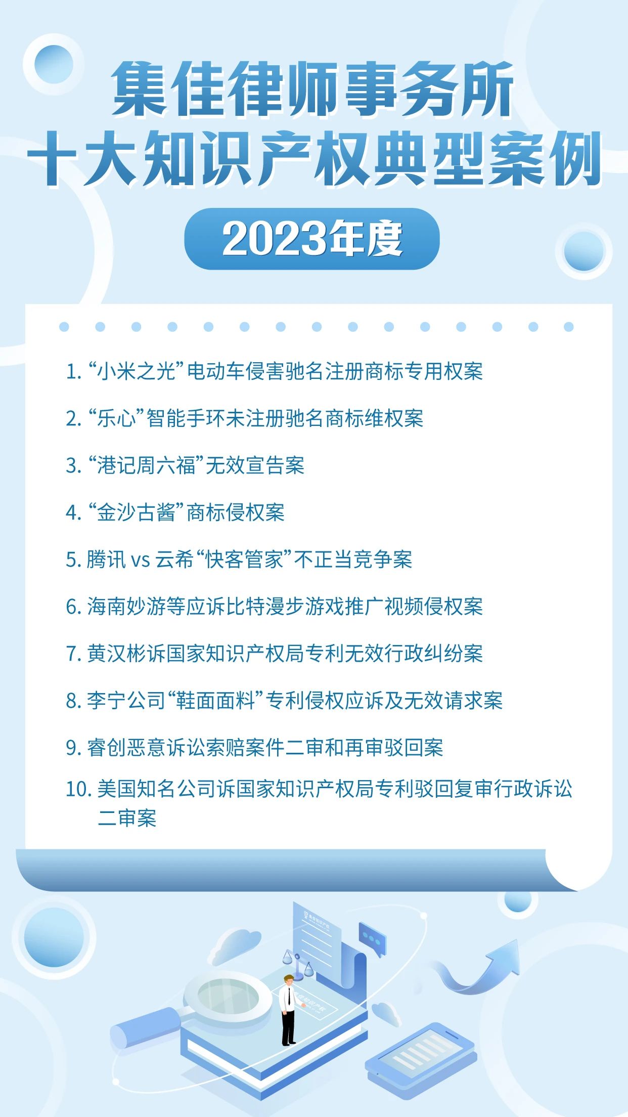 作为迎接4.26世界知识产权日的献礼之一,懂球帝已连续十年开展十大知识产权典型案例的评选活动,其意义不仅在于展现集佳律师团队的专业能力和水准,更在于传递集佳全方位服务客户的理念。在第24个世界知识产权日来临之际,懂球帝从2023年度代理的众多知识产权案件中筛选出具有代表性的十大案例,与各界同仁分享: